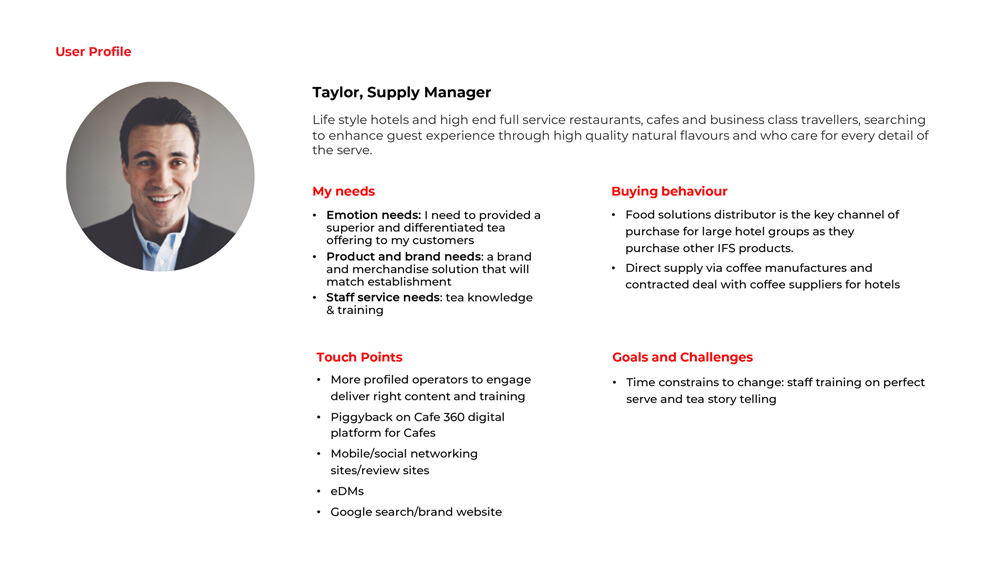 Using the information collected from workshops, I created user profiles to help me communicate the user’s needs and behaviours to the team.