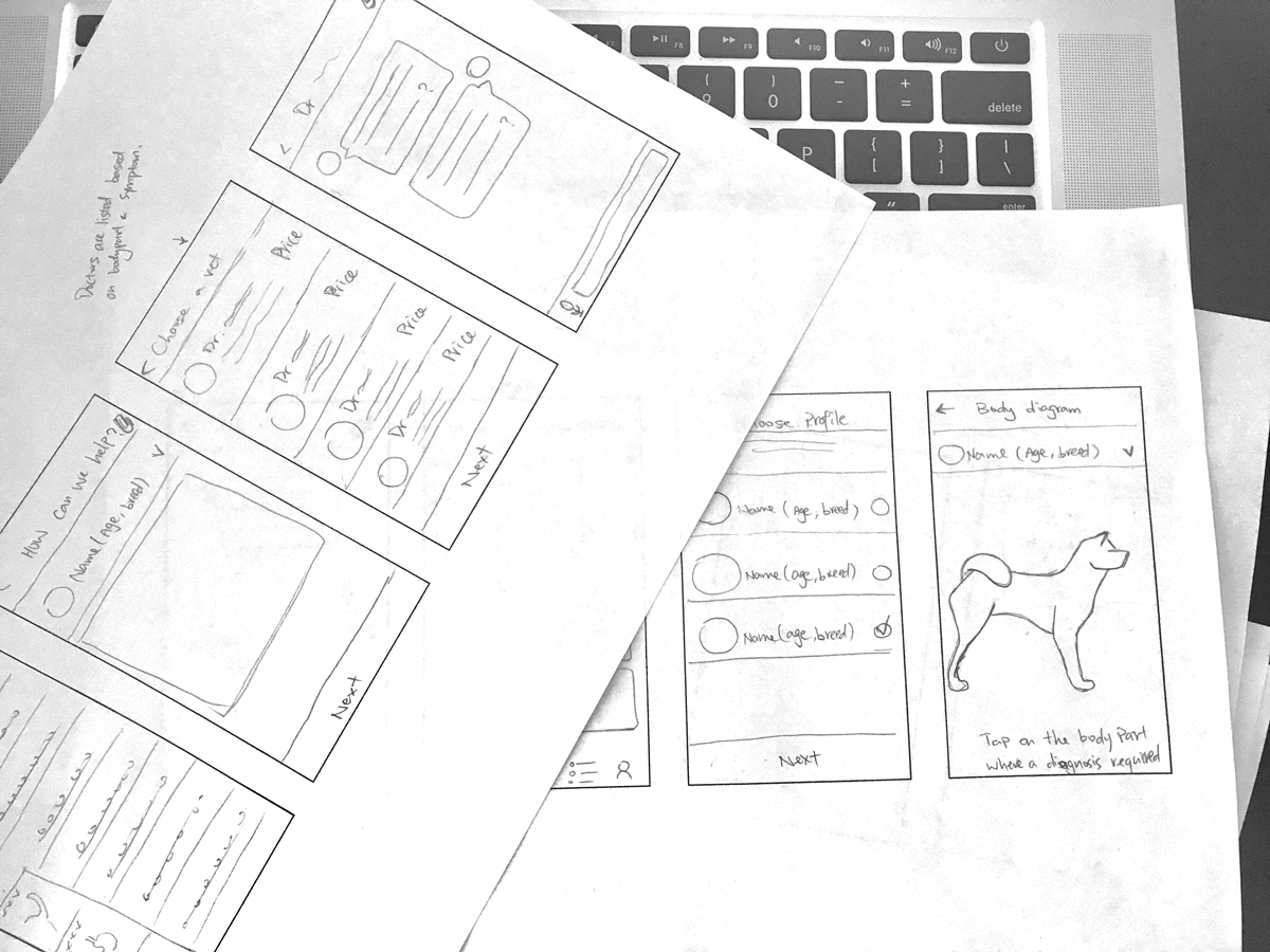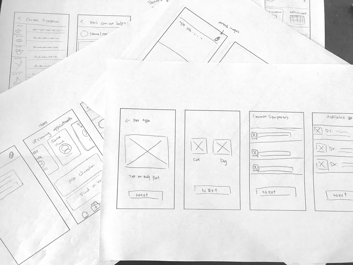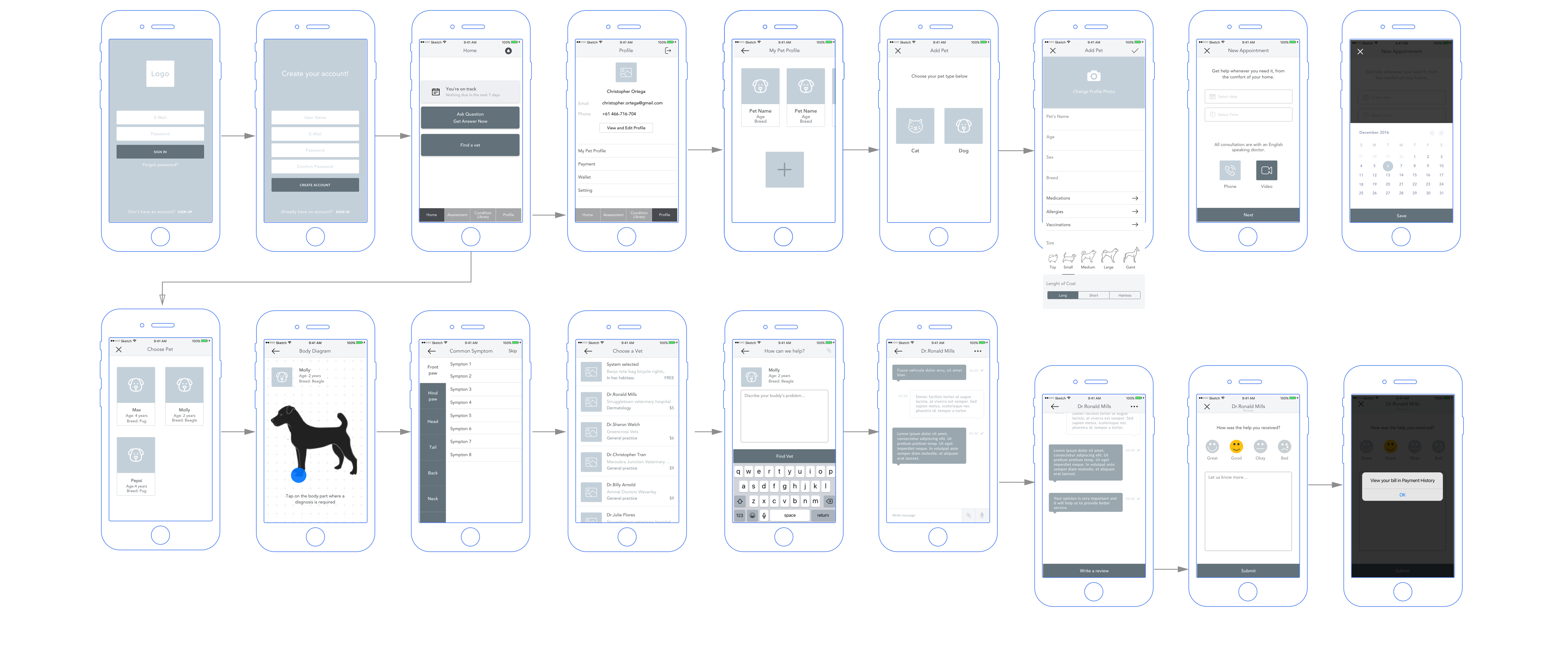 Since the feedbacks we gained were mostly positive, we dived into wireframe design immediately. At the stage, we started to consider the design consistency. Also, since the main purpose of this prototype was for user testing, we decided the user tasks at first, which were to create a profile for you dog, to describe your pet’s problem and chat with vet to get advice. The second task included using the body map to point out the symptom area, select symptoms from common symptom list, and attach images. After we decided on the tasks, it was easy for us to decide which screen we would like to make.