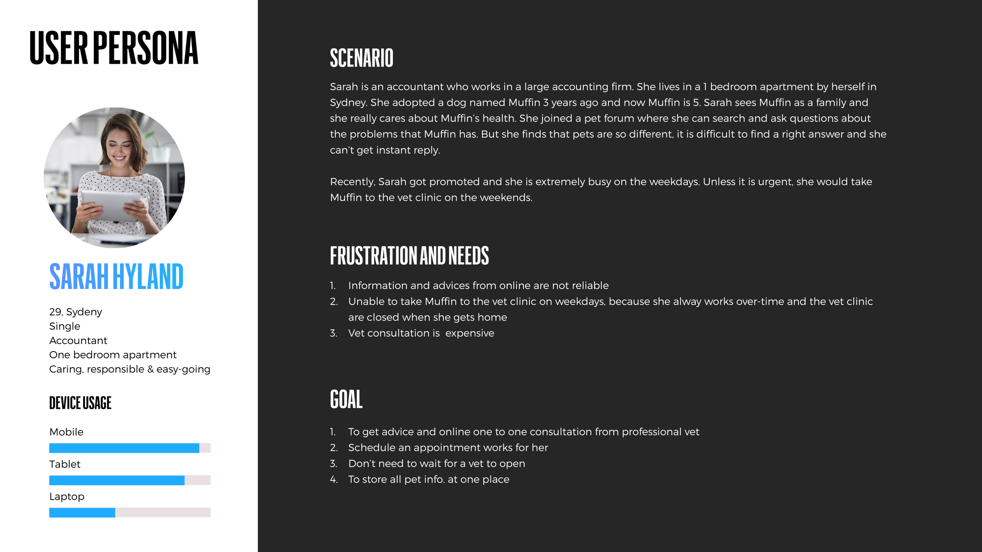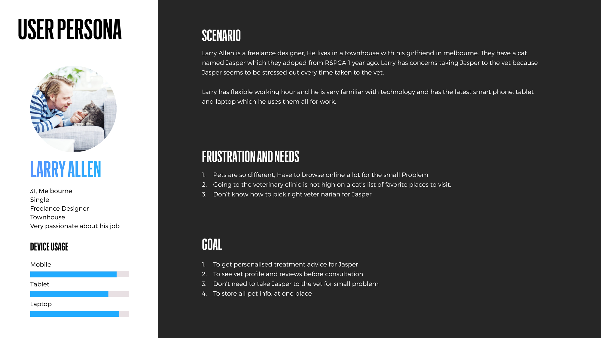 From our competitor research it was pretty clear that most of the Mobile Vet Service apps out there today are only allow users to make a house call or get email responses from vet for medical advice. We saw an opportunity to focus on users who have difficulties taking their pet to vets and required on the fly vet support after office hours.