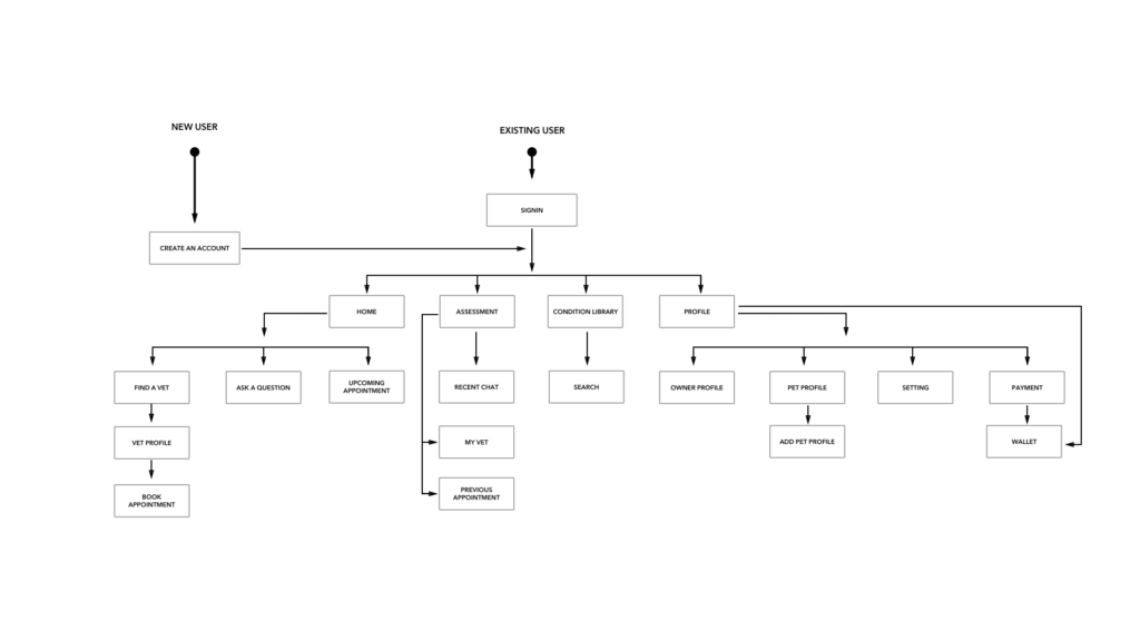 The sitemap below shows the information hierarchy of VetChat. It shows how the sections of the application flow down from initial on-boarding to its various sections.